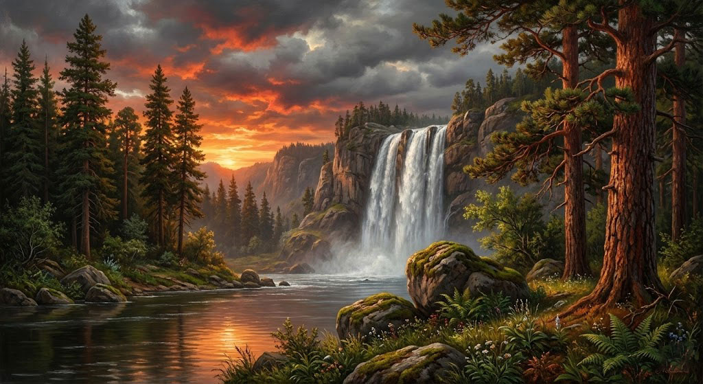 Эта картина - мастерски выполненный масляный пейзаж, изображающий величественный водопад в лучах заката. Мощный поток воды низвергается со скалистого обрыва в окружении густого хвойного леса. Небо озарено драматическим закатом: сквозь тяжелые серые тучи пробиваются яркие оранжевые и красные облака, создавая кинематографическое освещение. Слева возвышаются стройные зеленые ели, а справа — массивные сосны с характерной красноватой корой. На переднем плане спокойная река, берега которой усыпаны мшистыми валунами, папоротниками и лесными цветами. Картина отличается высокой детализацией и богатой текстурой, свойственной традиционной масляной живописи.