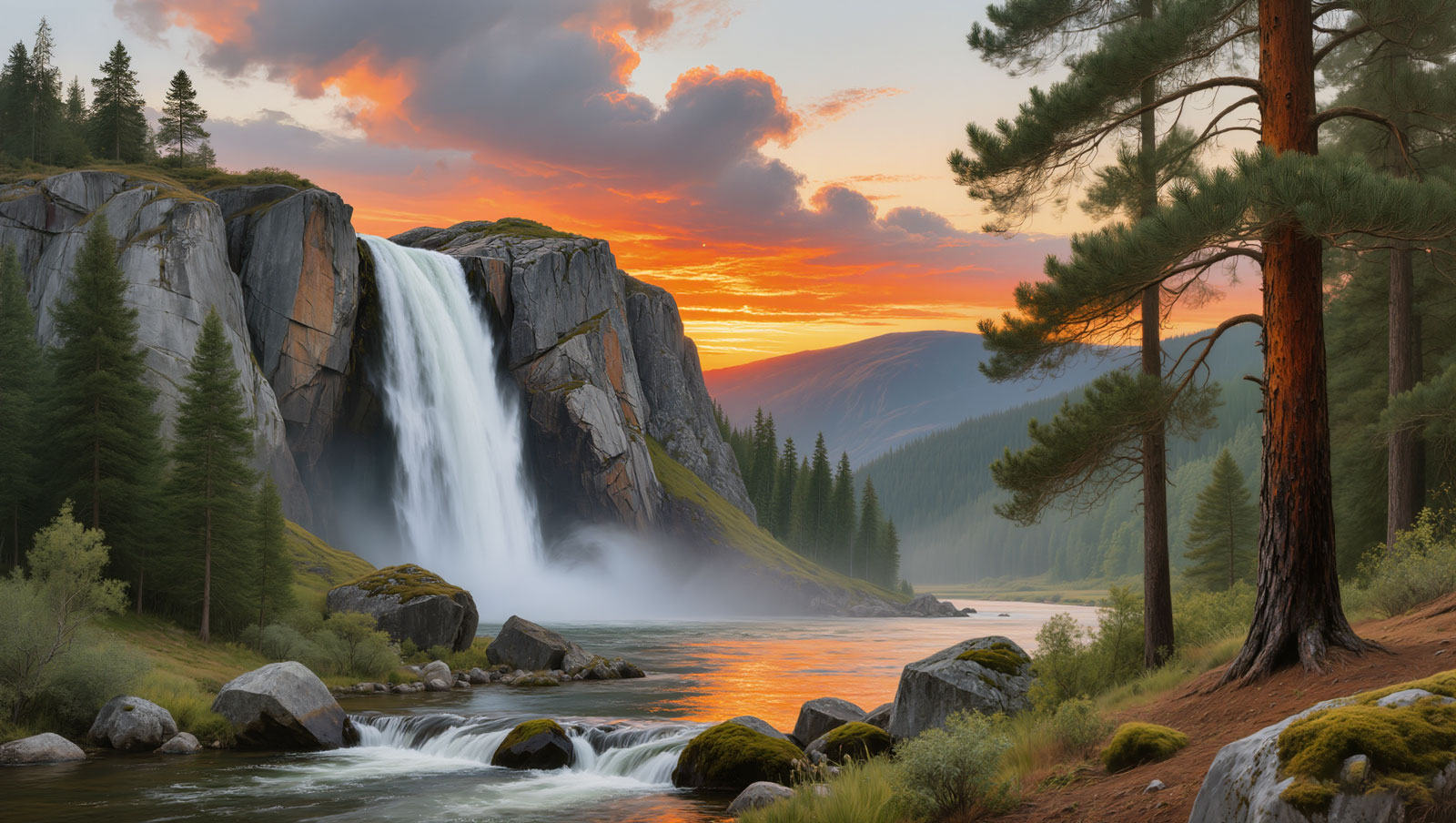 Захватывающий дух пейзаж, передающий красоту и мощь дикой природы. Драматический свет заходящего солнца пронзает грозовое небо, заливая сцену теплым, золотистым сиянием и создавая глубокие тени. Бурный водопад является центром композиции, его шум словно слышен сквозь тишину леса. Эта картина маслом вызывает чувство благоговения и умиротворения, приглашая зрителя насладиться моментом величественной красоты природы..